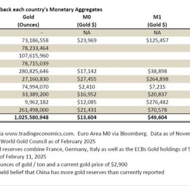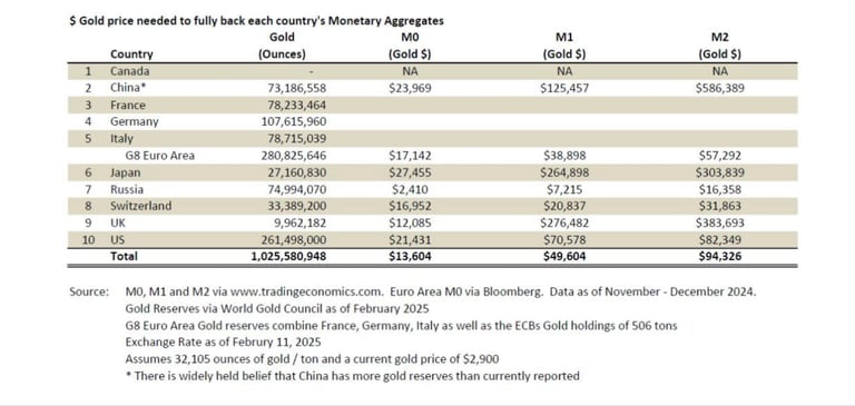 En analyse af de monetære mængder viser, at for at dække verdens nuværende FIAT-valutaer med guld, ville priserne skulle stige markant. Dette er tydeligt i tabellen nedenfor, som viser hvor meget guld skal koste for at fuldt understøtte M0, M1 og M2 pengemængderne i forskellige nationer: