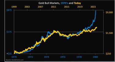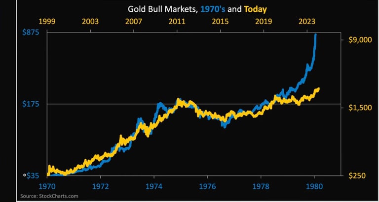 Det medfølgende diagram sammenligner guldmarkedets udvikling i 70'erne med den nuværende bull-markedstendens, og parallellerne er slående.